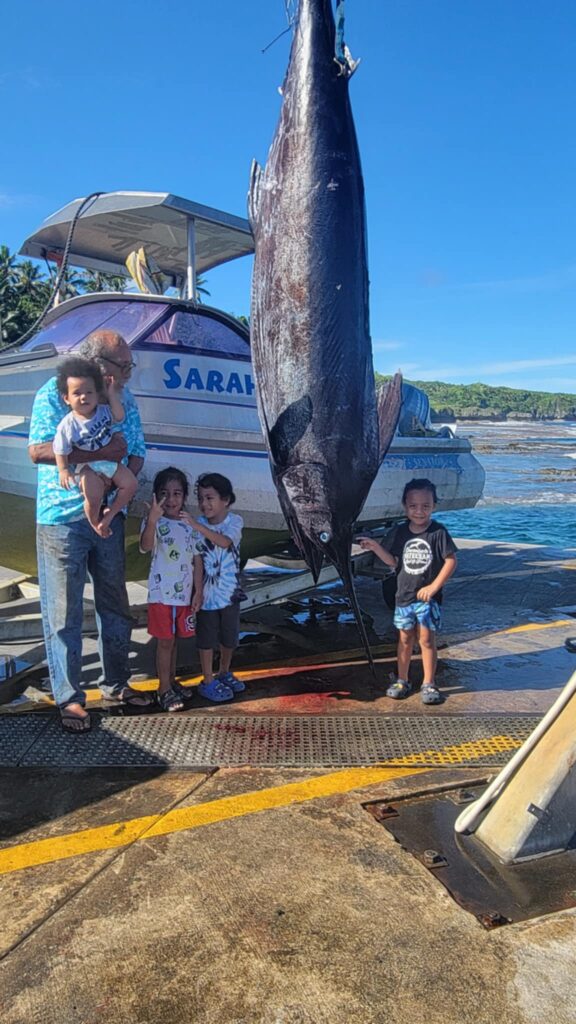 Atoa Talagi said it took him nearly an hour to reel in the giant fish from the Aliutu FAD in Alofi this morning. He told BCN News that he couldn’t lift it on to the boat so he dragged it a short distance to the Sir Robert’s wharf and used the crane to lift it out of the water.