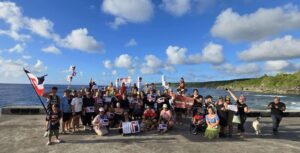 Around 60 participants joined the rally from Alofi Commercial Centre to Sir Robert’s Wharf to show solidarity with tangata whenua in Aotearoa