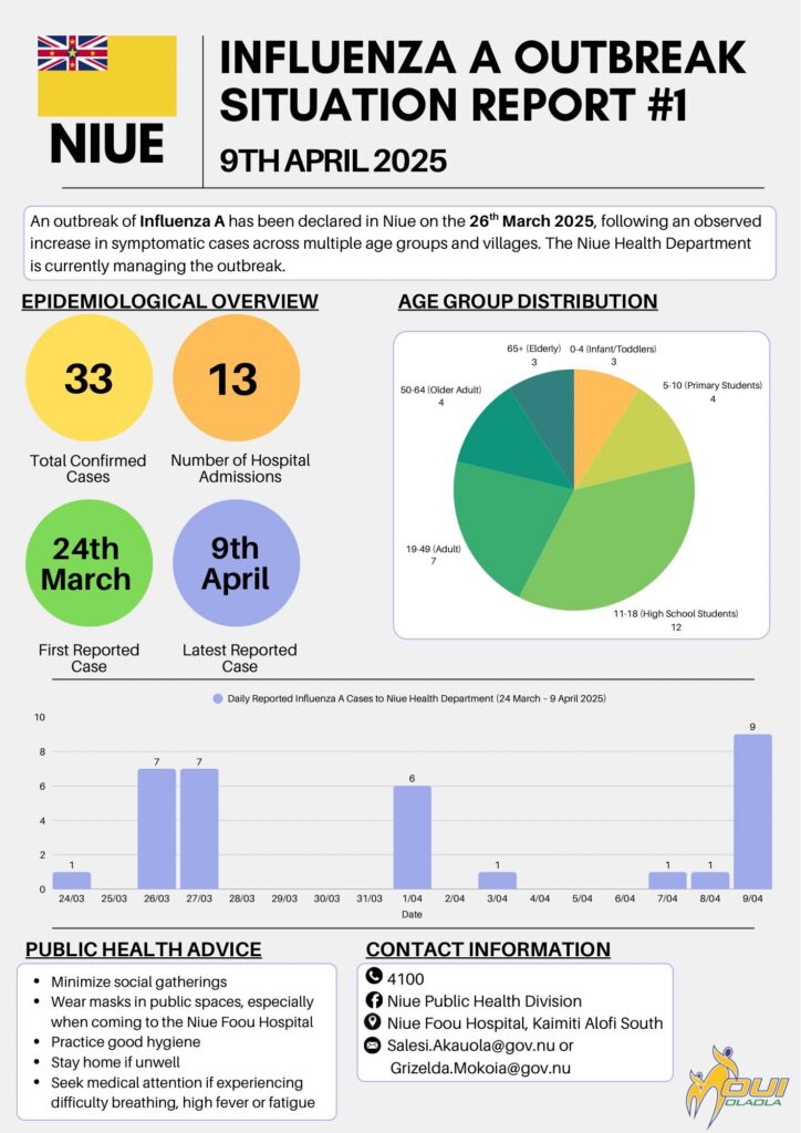 In an update from Niue’s Public Health division last Thursday April 10th, a total of 33 influenza A cases have been confirmed since the outbreak was declared on the 26th of March.