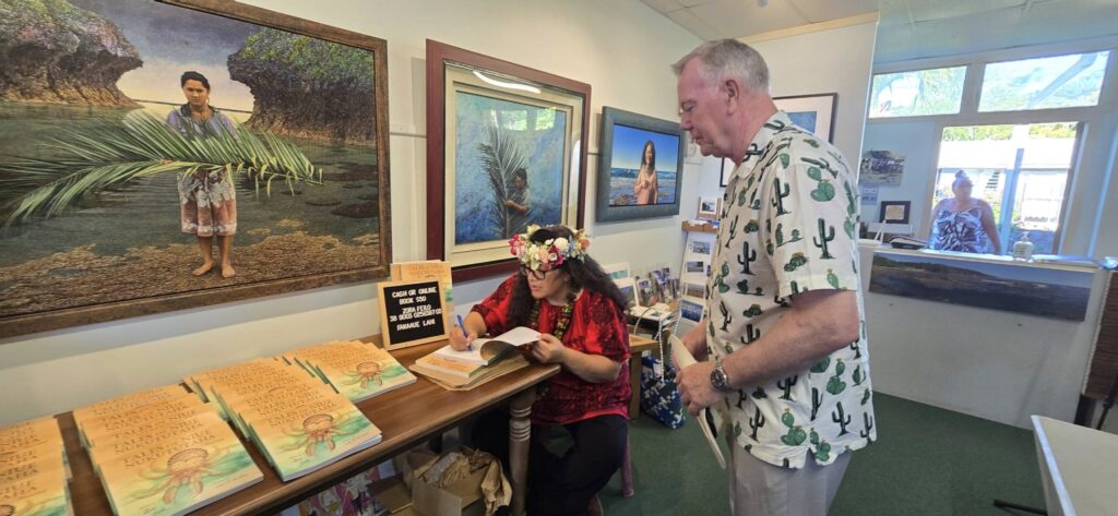 Zora also signed books with every purchase during the launch as a crowd gathered at Tahiono Gallery in Alofi.